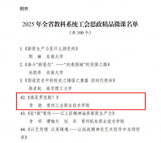 近日,江苏省教育科技工会公布了全省教科系统工会思政精品微课征集遴选结果,在全省163家基层工会推荐的391个各类思政微课作品中,共遴选出100个政治方向正确、内容科学严谨、形式创新多样的思政精品微课。我校马克思主义学院李艳老师的思政微课作品《谁是罗忠毅?》成功入选。